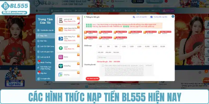 Nạp tiền BL555 là bước đầu tiên giúp người chơi bắt đầu trải nghiệm các sản phẩm giải trí trên nền tảng này. Với quy trình đơn giản hệ thống thanh toán an toàn, nền tảng mang đến nhiều phương thức gửi linh hoạt, đáp ứng nhu cầu của mọi hội viên.